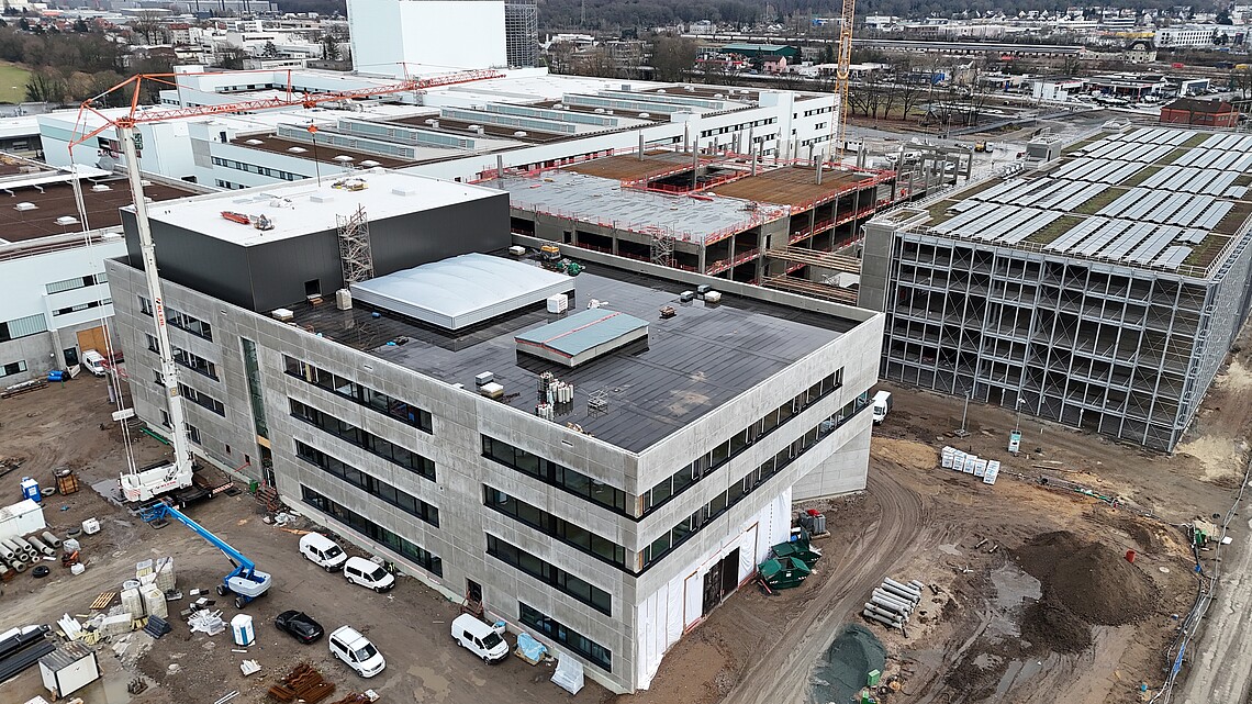 Der Hochbau für Bauteil 5 (Fertigung und Oberfläche) beginnt wie geplant. Die Arbeiten an den Köcherfundamenten sind bereits im Gange. Diese vertikalen, zylindrischen Beton- oder Stahlbeton-Säulen tragen die Lasten von Stützen oder Säulen und leiten sie in den Untergrund ab. In den nächsten zwei Wochen werden die Fundamente fertiggestellt, der Seilbagger wechselt das Baufeld, und das nächste Gebäude kann in die Höhe wachsen.